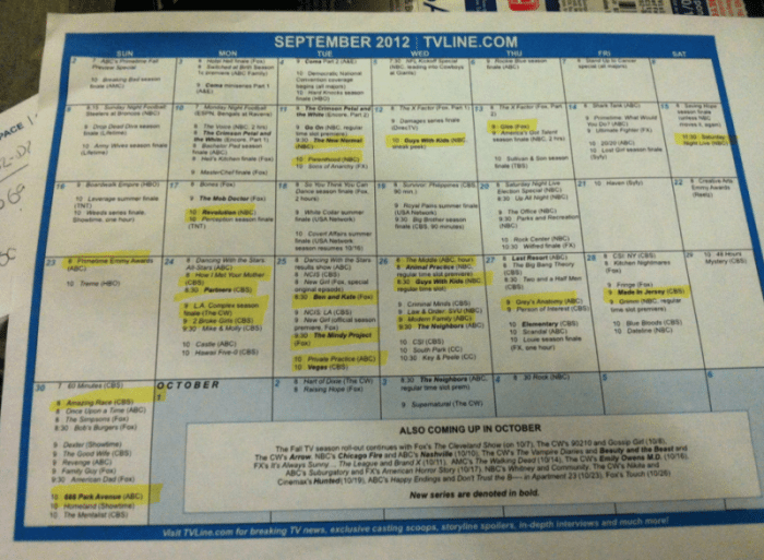 I’m currently in the depths of fall tv season. I schedule out every new show on tv. I figure out if I can watch them on my DVR or if I have to watch them on Hulu later. This is an example of my calendar for shows I can DVR (also highlighted are some shows that I love and just wanted to remember the premiere dates):